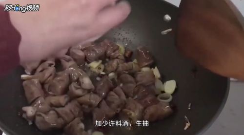 锅中放油放入花椒,再倒入葱姜蒜炒香,倒入大肠翻炒。