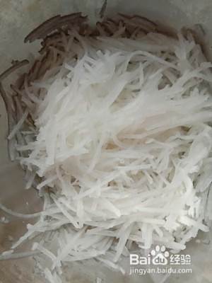 白萝卜切成细丝,加盐腌制30分钟左右