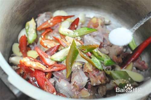撒上辣椒块,撒上盐,盖上盖子,用力抛动几下,让里面的食材均匀混合起来;