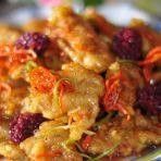 将猪里脊切成刀背厚的大片,放入碗中,加少许盐拌匀。将泡好的淀粉加到肉里裹匀每片肉,锅中倒油加热。逐一下入肉片炸至浮起捞出,油温完全升高后下入肉片复炸捞出。将黑莓汁、糖、醋、葱、姜、蒜放在碗中调成汁,将锅中的油倒出,倒入果汁炒至粘稠后下入肉片,胡萝卜丝和香菜丝挂汁出锅。