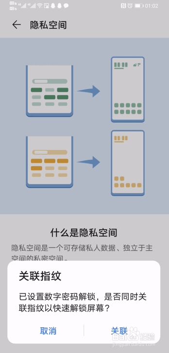 开启隐私空间后,页面会弹出关联指纹,点击关联。