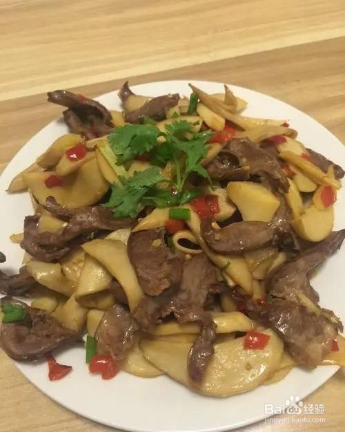 锅内倒入少许油,放入葱花炒香,放入杏鲍菇翻炒至变软后放入猪心煸炒2分钟。
