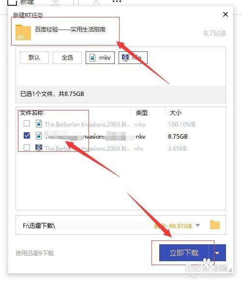 5、接着,在弹出“新建磁力链接”的窗口中,勾选需要下载的文件和取消没用的文件的,然后点击上方的文件夹名称,修改文件名称,完成后点击下方的“立即下载”接着,等待软件自动将文件下载完成即可。