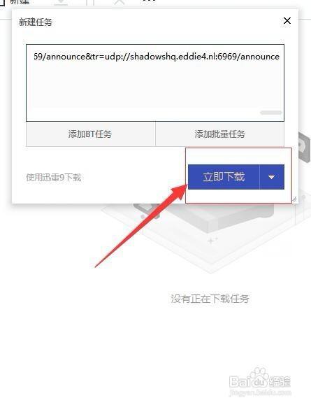 4、如果未弹出,点击菜单栏中的“新建”,在弹出的窗口将磁力链接粘贴进去并点击“立即下载”。如图: