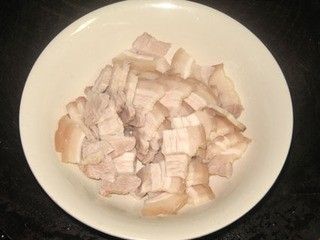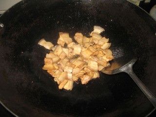起油锅,下五花肉煸炒,让它出一下油,然后加点生抽调味。