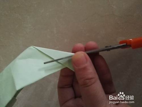 然后打开里面,沿刚才的折痕把里面收进去并折进来,形成两个开口,并用剪刀剪一个小口子。两边都要剪。