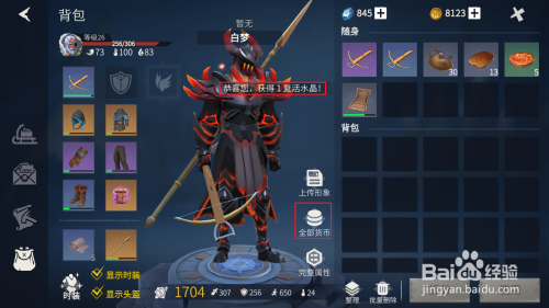 4、看到恭喜你,获得1复活水晶提示后,说明复活水晶次数加1,点击全部货币图标