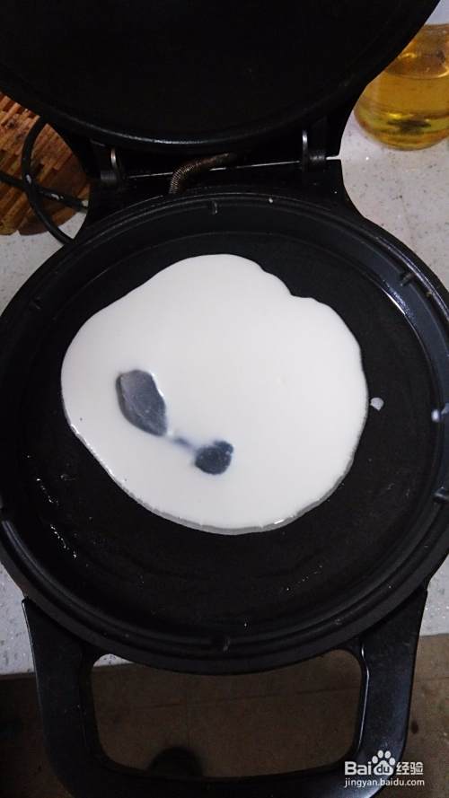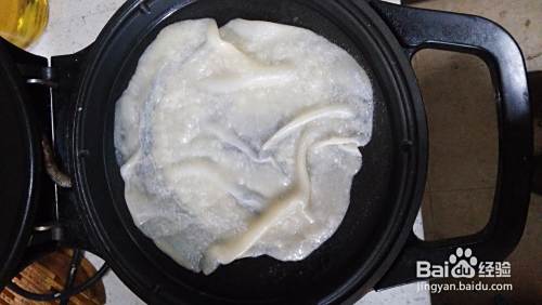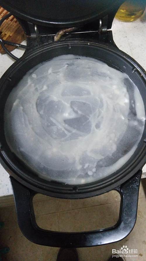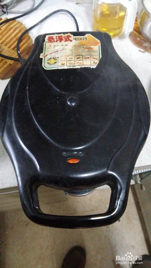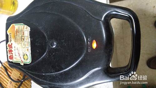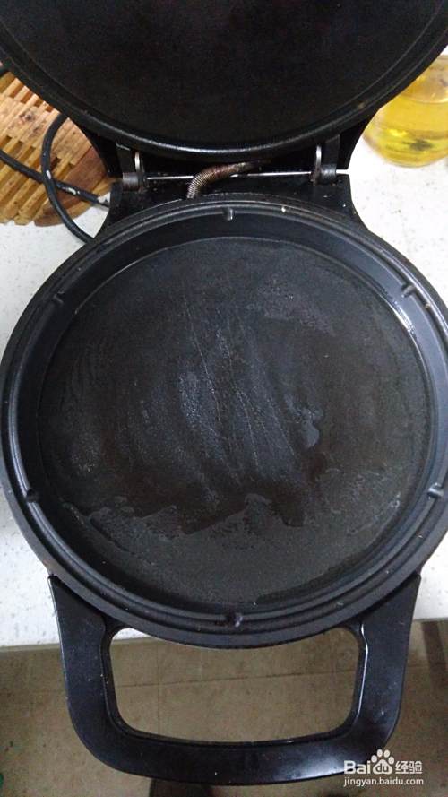 电饼铛上油(热火凉油),用油刷子刷一下,不可刷过多。