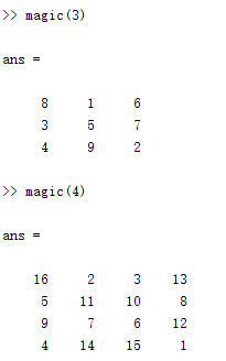 魔方矩阵的创建。魔方矩阵指各行各列和对角线元素和相等的矩阵,使用magic函数,调用格式为: