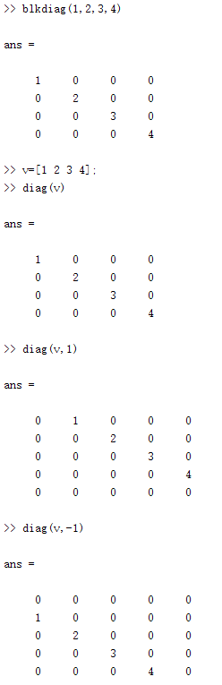 A=diag(v,k) 以v的元素为A矩阵第k条对角线的元素。