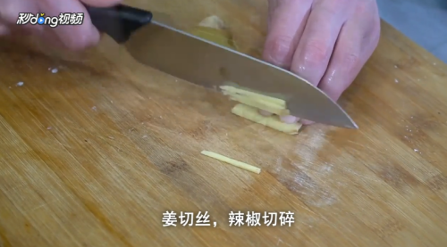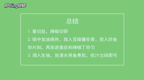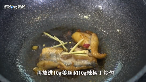 放入豆瓣酱炒香,放入炸鱼炒片刻,放进姜丝和辣椒丁炒匀。