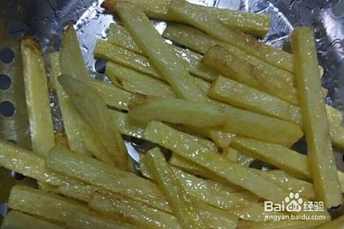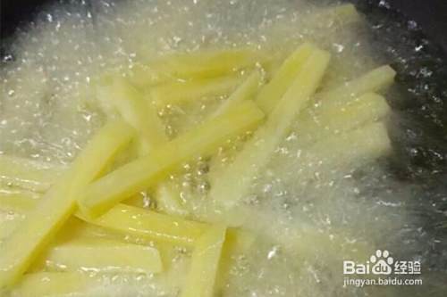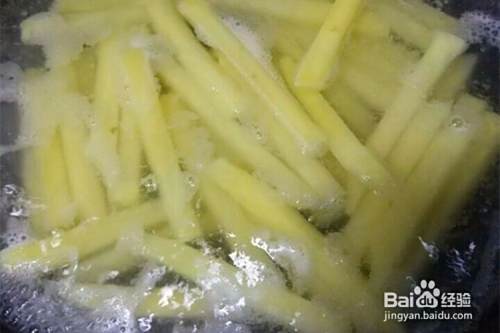 锅内倒入食用油(要稍微多一点),倒入土豆条进去炸,不停的翻动,多反复炸几次