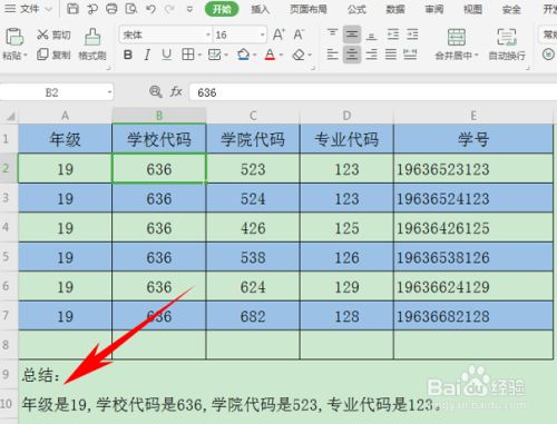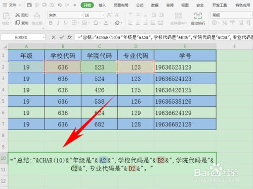 在这里,我们可以为公式加入换行符公式CHAR(10),最后公式为=”总结:”&CHAR(10)&”年级是”&A2&”,学校代码是”&B2&”,学院代码是”&C2&”,专业代码是”&D2&”: