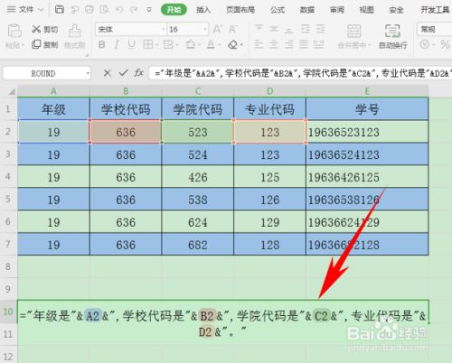 双击可以看到公式为=”年级是”&A2&”,学校代码是”&B2&”,学院代码是”&C2&”,专业代码是”&D2&”: