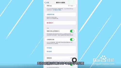 苹果13开启了注视感知功能导致手机铃声突然变小,进入面容id与密码页面之后把注视感知功能设置为关闭即可解决问题。