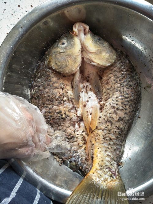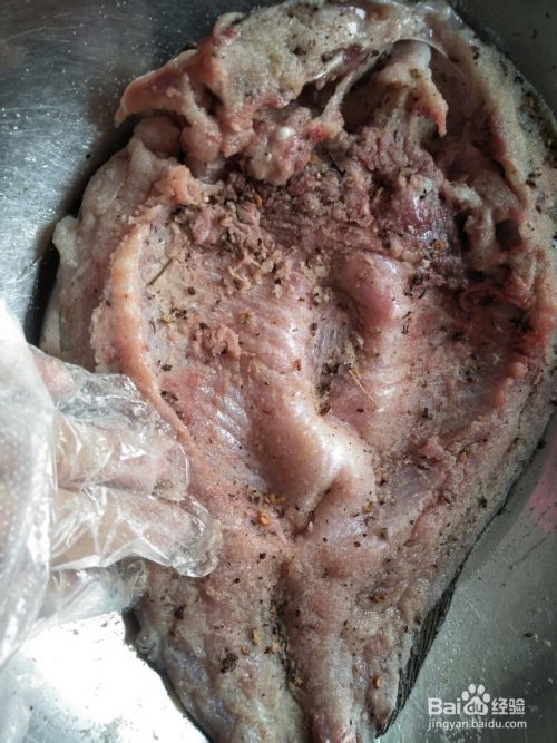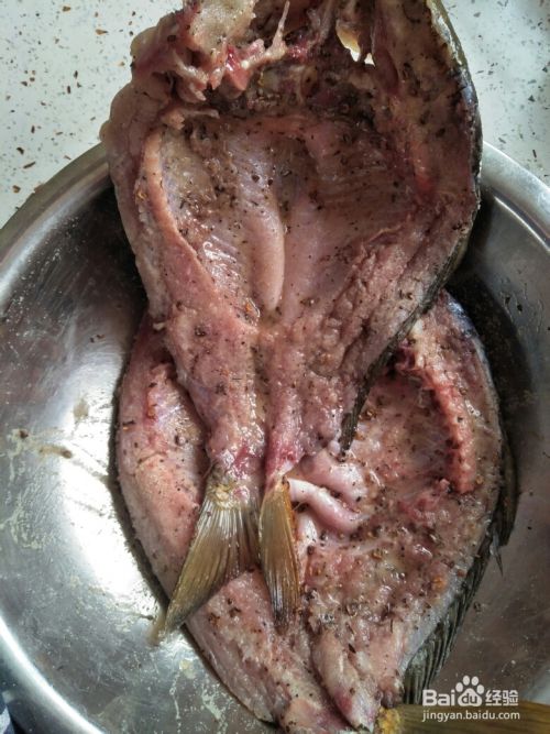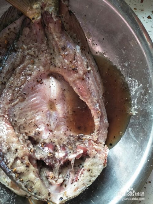 在切好的鱼上涂抹胡椒盐,均匀涂抹,鱼尾、鱼头和切好的鱼背部应涂抹。