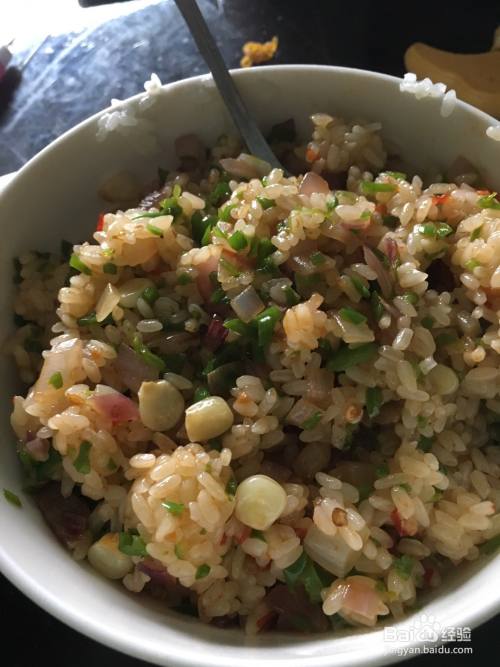 好啦,现在准备炒饭的配料。先把青椒和洋葱切丁,小小的丁哟。米饭煮熟。玉米粒。辣酱,备齐。开始炒吧:锅里放油、油热后将洋葱和青椒炒香后放玉米粒,翻炒下放米粉,然后就是辣椒,注意要试试咸淡,米饭不要太咸。适量的咸味就好。