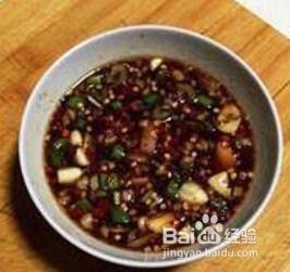 将1.5汤匙豆瓣酱;1汤匙酱油;1茶匙料酒;1茶匙蚝油;1茶匙砂糖;0.5茶匙香油;少许味精;1/3的大蒜;1/3的葱花;少许盐(根据个人口味);全部辣椒,以及与以上材料体积1.5-2倍的水兑成酱汁。