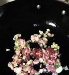 锅内留油少许,待油三成热时,依次加入1/3葱花,1/3大蒜,姜丝,胡椒粉炝锅。加入五花肉丁炒散变色。