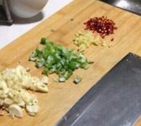 葱切葱花,蒜切碎,姜切丝,干红椒切碎。