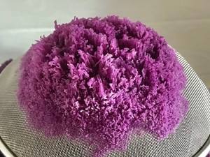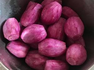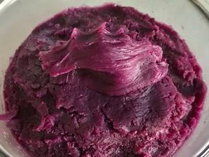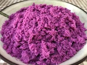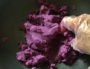 4、待紫薯稍加冷却后,戴上一次性手套,用手抓捏成泥,好的紫薯蒸熟后不仅起沙,而且里面也不会硬结,抓捏几下就很细腻;