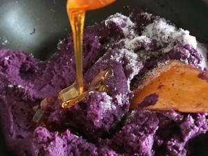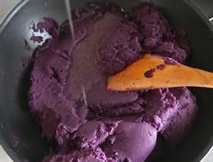 5、将紫薯泥放入不粘锅,加入黄油后中小火慢慢炒制,直至黄油和紫薯泥完全融合后再倒入玉米油,继续炒至完全融合;