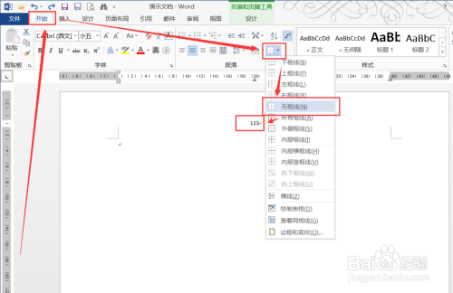 进入【开始】-【段落】,在“边框”中选择“无框线”。