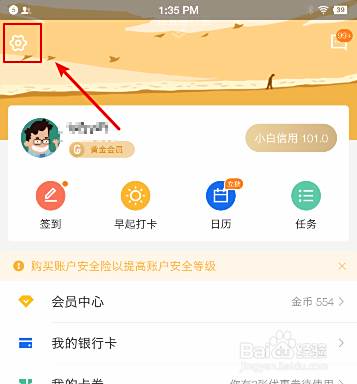 在个人中心页面,点击左上角的锯齿状的设置图标,进入到设置菜单。