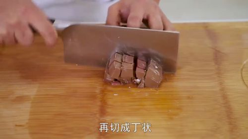 2将鸭血从中间片开,改刀切成条,再切成丁状。