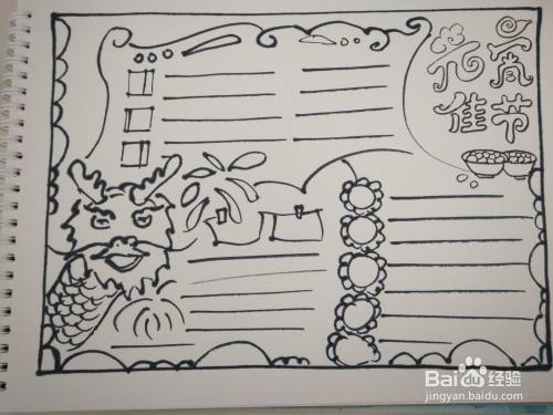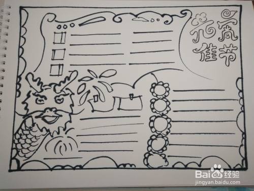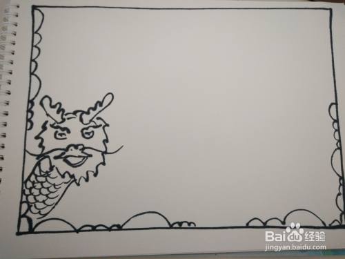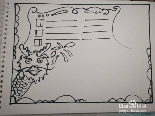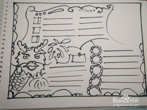 首先绘制手抄报的边框,然后绘制边龙头,再然后绘制内部的横线格子以及装饰物,最后在右上角绘制标题。