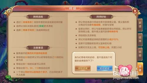 如果双方都角色有意的话,就由师父组队,组上徒弟,2人一起到龙城观音院主持无恙处,师父与无恙对话,选择“带弟子拜师”即可完成收徒。