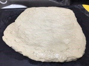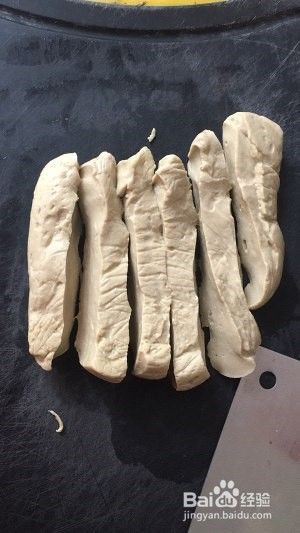 醒一个小时后的面筋,捏出水分,按扁切,表面光滑了许多。