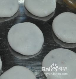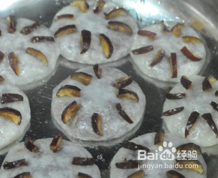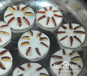 将红枣去核后剪成条,摆在玉兰饼上,糯米有念性,不用刷水,稍微按紧即可。