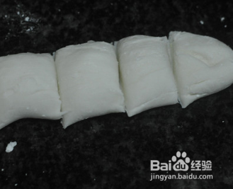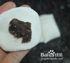 将小剂子放在手心搓圆,稍微压扁后放入红豆馅,包包子一样包起来,粉团里加了油,不会太粘手,如果粘的话可以撒点糯米粉防粘。