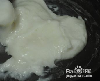 将拌好的糊糊倒入锅中,一边加热,一边不停地搅拌。直到搅拌成这样的粘稠、透明状。倒入准备好的猪油和糖搅拌均匀,关火。