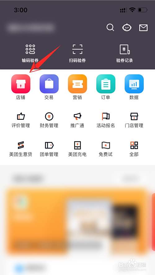 进入手机上的美团开店宝软件,点击店铺功能。