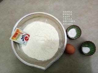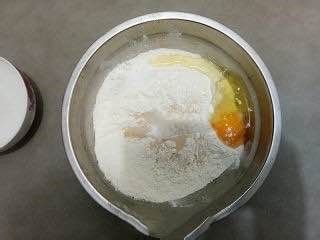 500克面粉中加入5克小苏打、6克食盐、3克酵母粉、1个鸡蛋。(注意!!!食盐和酵母粉、小苏打分开放,分别放在面粉两边,不要混在一起)。