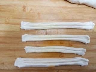 回暖的面团不要揉,面团的延展性很好,直接用手拍成长条,用擀面杖轻轻擀成比较规则的宽为五六厘米厚度为半厘米的长条。