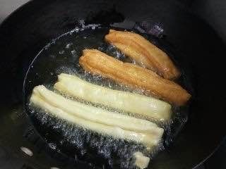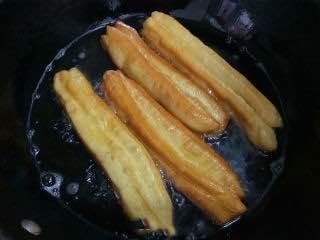 锅中放油,油温升至180度左右,放入油条坯子开始炸制,放入后不要立刻翻动,炸制大约几秒后,稍稍定型在不断的翻面,防止一面炸过一面不熟。(如果没有温度计,可以在油锅中放一小块面团,小面团浮上来后周围有少量的小气泡就可以)