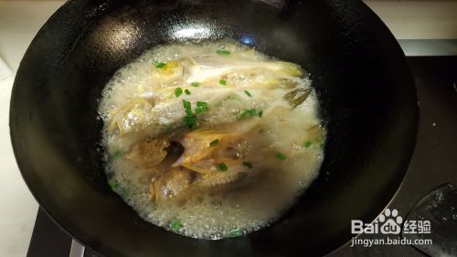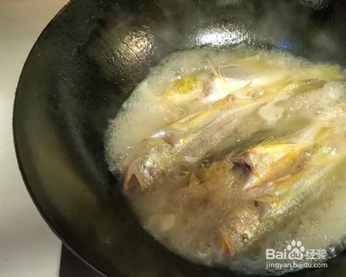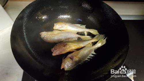 放入梅童鱼,单面稍微煎一下,加入料酒。