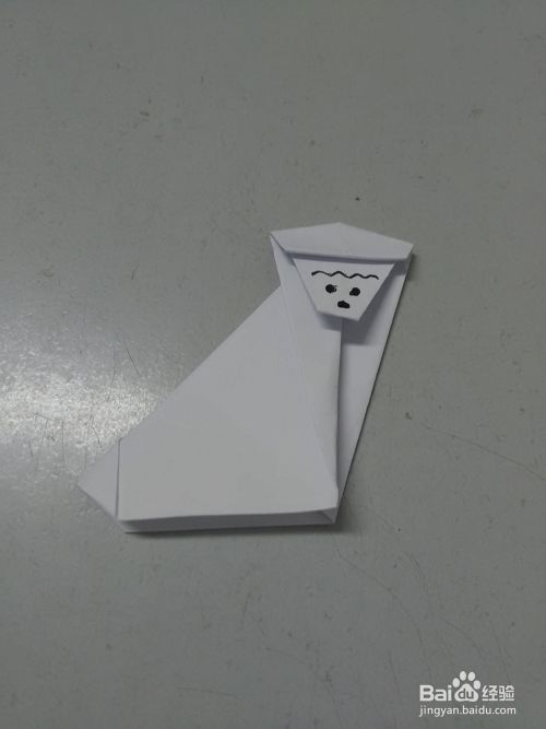 再用笔在皱纹下面画三个椭圆形,表示两只眼睛和嘴,一只年老的猴子就折完了。