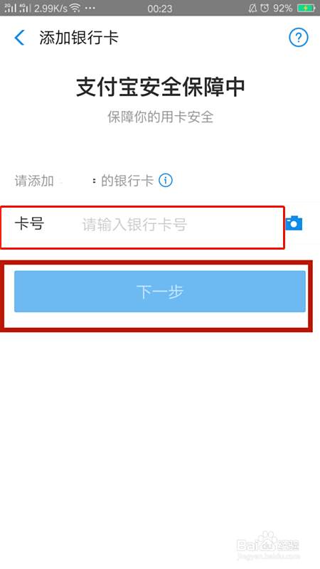 在新的页面中输入要添加绑定的银行卡卡号,输入完成点击下一步。