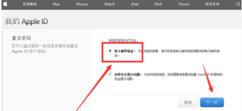 在弹出的页面选择重设密码的验证方式。这里演示一下用邮箱找回的方式(当然也可以尝试用”回答安全提示问题“的方式),点击”下一步“。