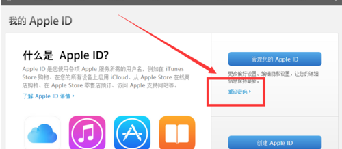 在Apple ID 管理页面中,点击“重设密码“。
