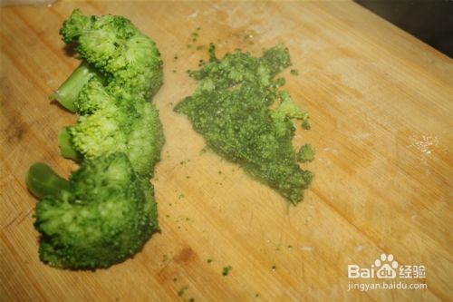 捞起煮熟的西兰花,用刀把花的表面切下,就成了很小的颗粒