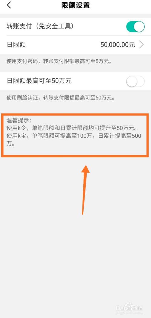 使用k宝,单笔限额可提高至100万,日累计提高至500万。