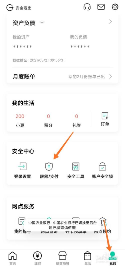 登录农行APP后,在我的页面点击限额/支付。