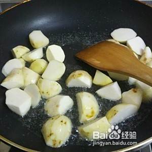 起油锅,将芋艿块倒进锅里略炒