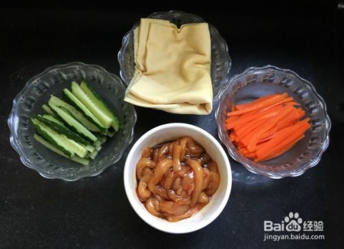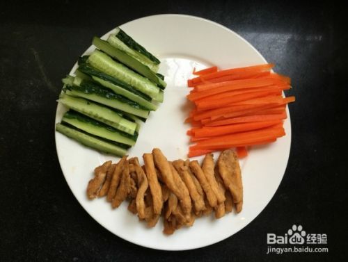 黄瓜切条状,胡萝卜切细条焯一下水或者用盐腌15分钟左右去一下土腥味鸡胸肉切条状用料酒、生抽和胡椒粉腌一会