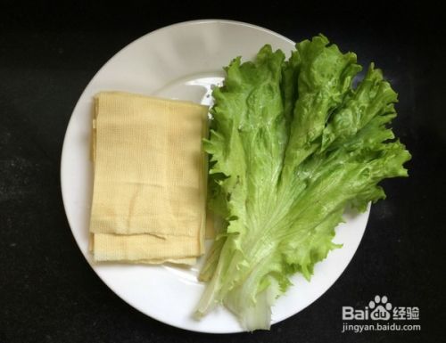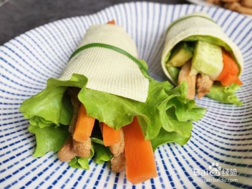 豆皮垫底,放生菜叶、黄瓜和胡萝卜,鸡胸肉酱可以放在里边,也可以卷起来吃的时候蘸蘸